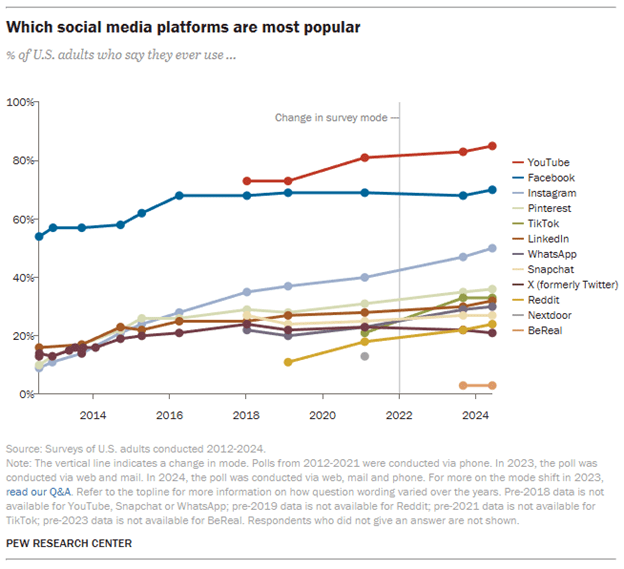 As stated above, social media has been on the rise for the last decade. The following graph is based on a study done by the Pew Research Center which demonstrates the rise of social media usage from 2012-2024.