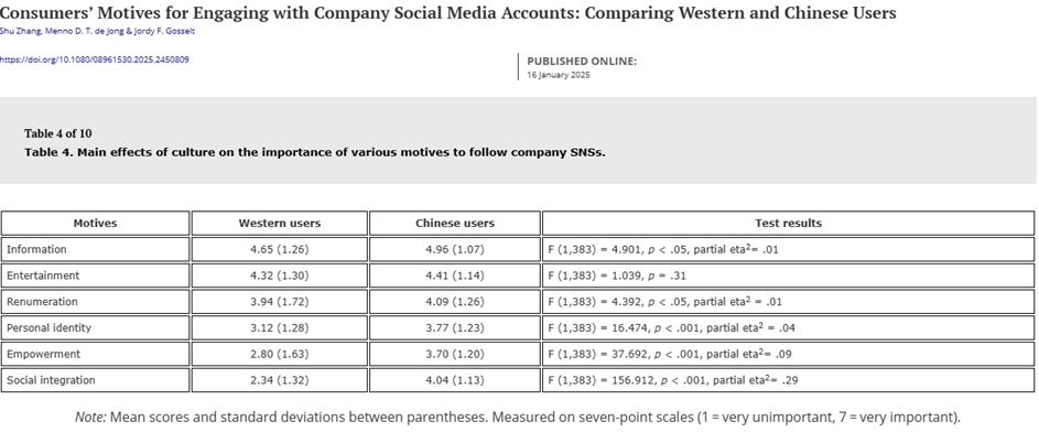 One study comparing both Western and Chinese social media users focused on why users engaged with certain businesses online. The study focused on the relation between culture and social media dependency, company social media-related behaviors, and motives of consumers to follow social media companies. The study found similar results to that of prior research, with social media dependency being higher in China than Western Europe and in relation, Chinese users being more likely to interact with company social media accounts than Western users. (Zhang, 2025) What that means for many businesses is that, in order to be globally successful, the business must adjust its social media practices to be successful in other cultures around the world. Please see the below table for their findings: